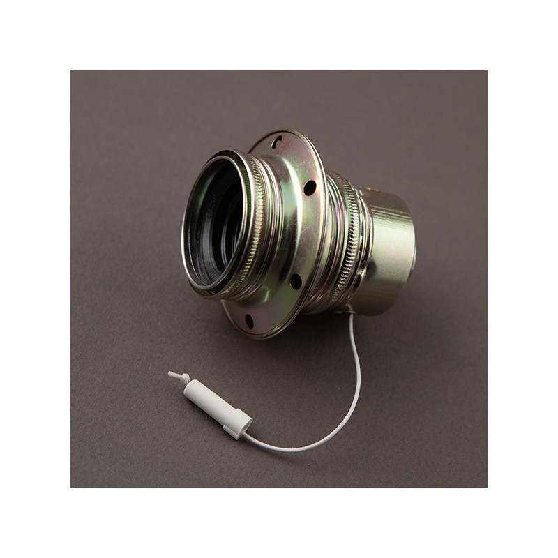 Douille E27 filetée avec inter à tirette et cordon, fer bichromaté, avec deux bagues à visser, Pour créer des lampes déco avec un switch à à chainette - Nouveau modèle, couleur plus claire