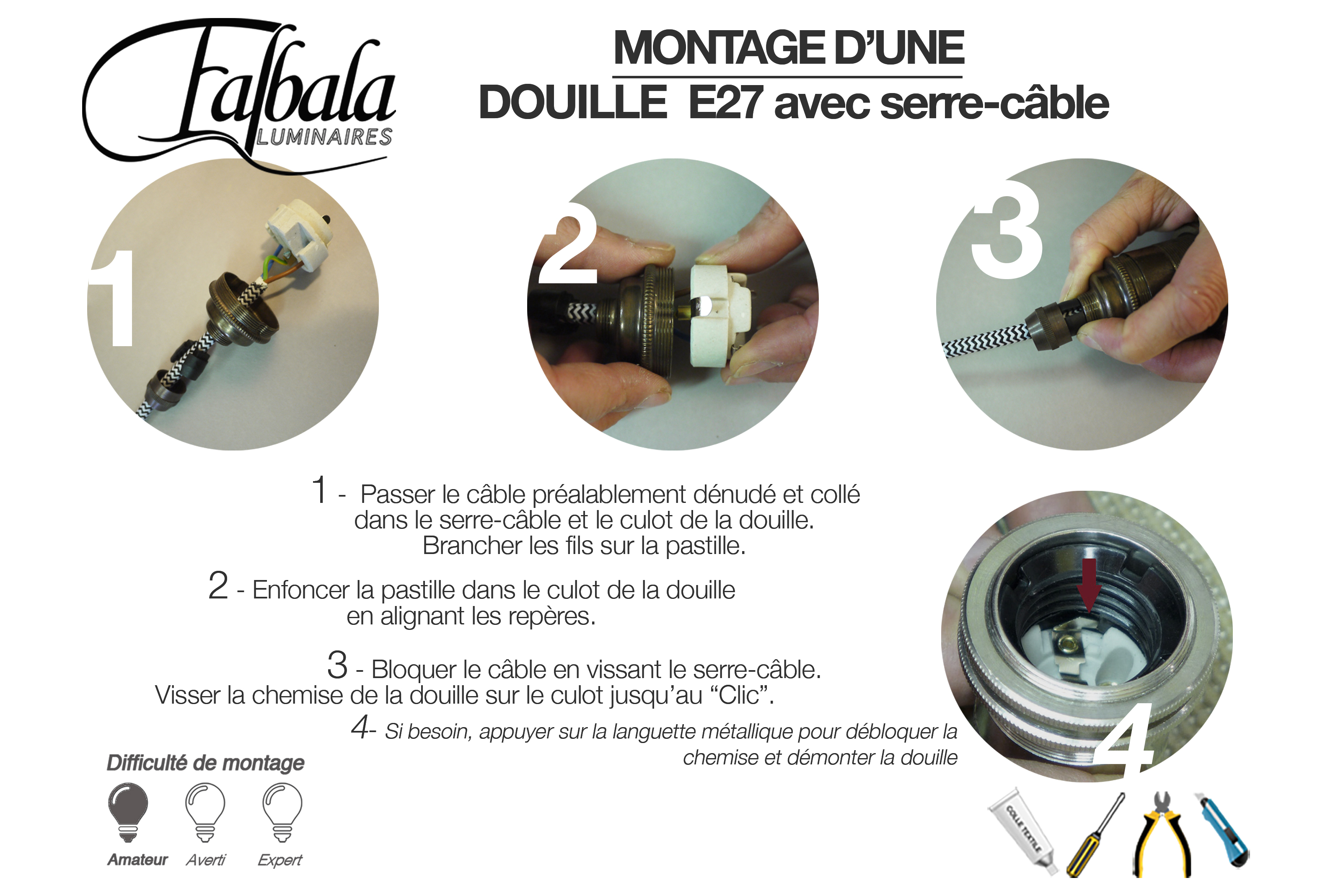 Pour un montage en suspension, n'oubliez pas d'ajouter un serre-câble laiton ou autre choix pour la sécurité de votre branchement ! Voir : https://www.falbala-luminaires.com/183-serre-cables