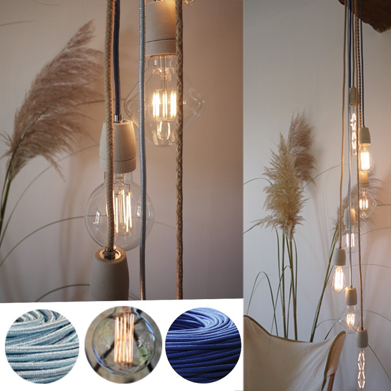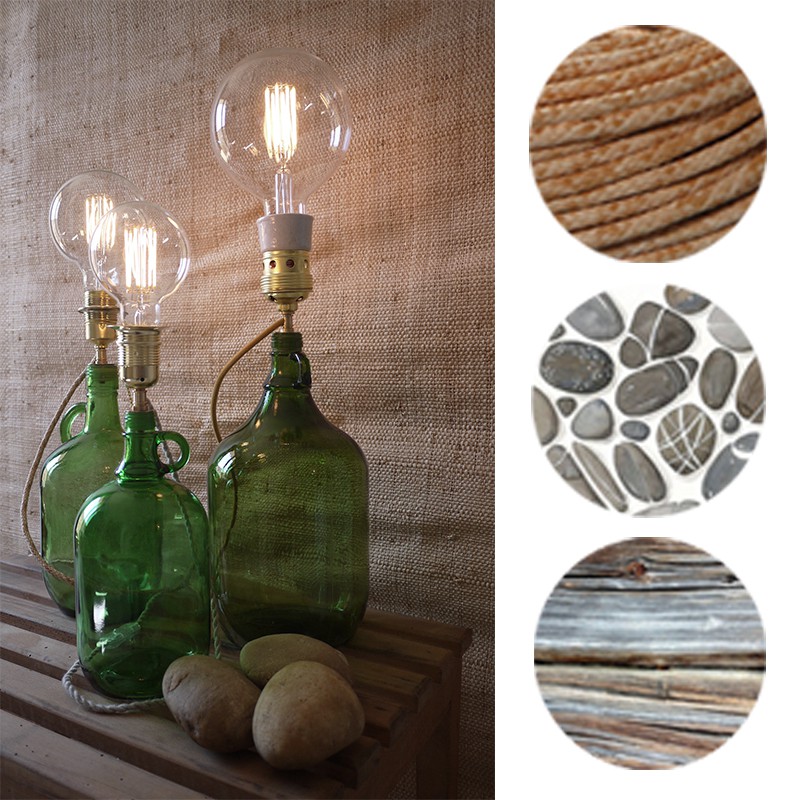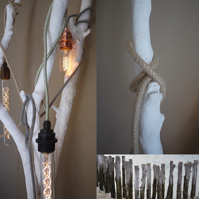Les matières naturelles évoquent la douce ambiance. Une bouteille à la mer et les branches de bois flotté se métamorphosent en lumière.