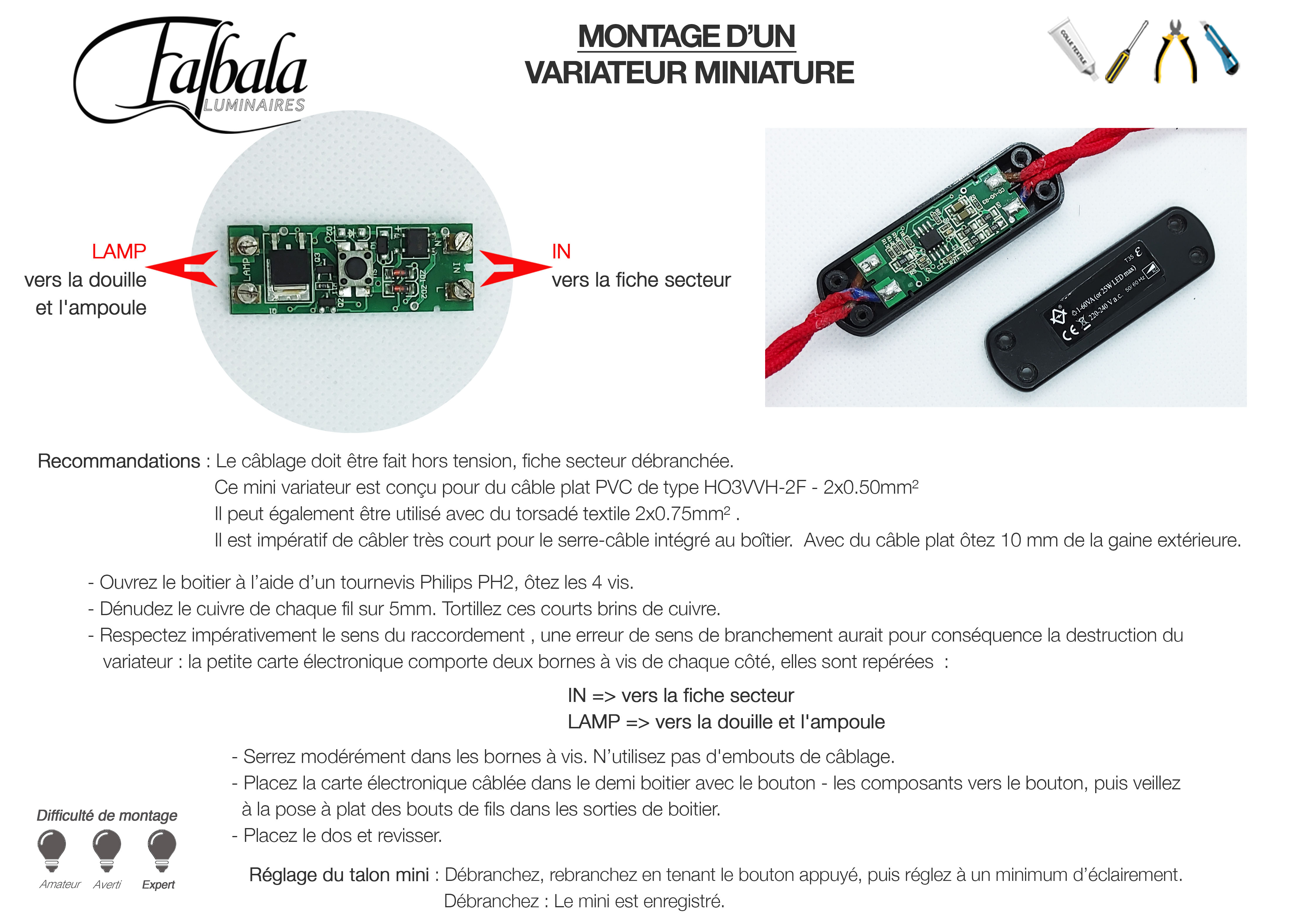 Mise en garde : ce variateur à la miniaturisation tres poussée demande beaucoup de minutie pour sa mise en oeuvre, donc pour utilsateur expert aux doigts de fée ; s'assurer notament de la fermeture correcte de son boitier, à cet effet le câblage doit être réalisé proprement. En raison de son faible volume il faut le câbler seulement avec du cable torsadé ou du cable PVC ovale, 2x0.50mm² maxi, en suivant nos recommandations pour la mise en oeuvre des cables textiles. Ne convient pas aux cables ronds ni au cable ovale 2x0,75mm2..