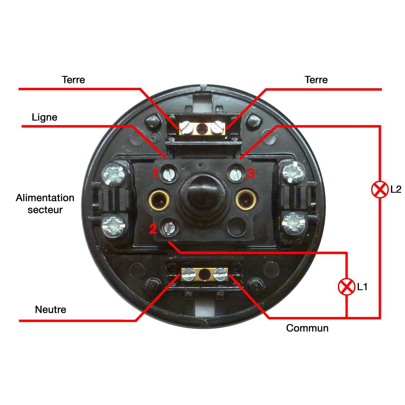 Note pour raccordement : seul le fil de Ligne (ou phase) est raccordé sur la borne 1, puis une lampe sur 2; l'autre lampe sur 3 ; le commun des deux lampes doit être raccordé au Neutre sur une borne séparée.